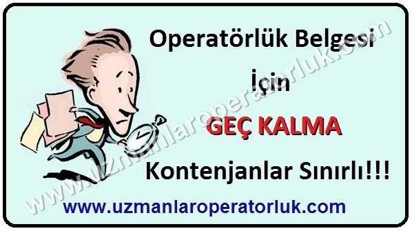 Milli Eğitim Bakanlığı tarafından her ay yapılan İş Makinası Operatörlük Sınavına katılabilmek için Operatör Adaylarının Uzmanlar İş Makinası ve Operatörlük Kursuna kayıt olabilmeleri her ayın ilk 10 günü gerçekleşmektedir. Bu tarihe kadar hazırlanması gereken evrakları hazırlayıp kursumuza müracaat edebilirsiniz.