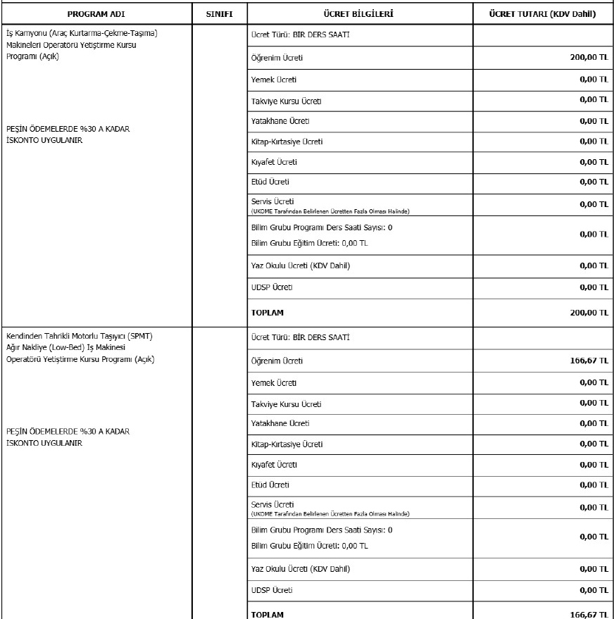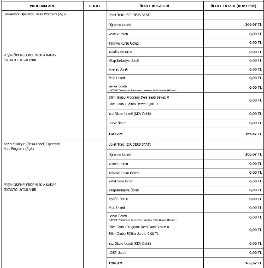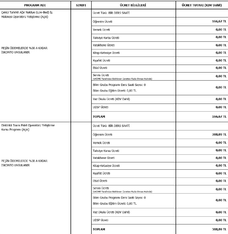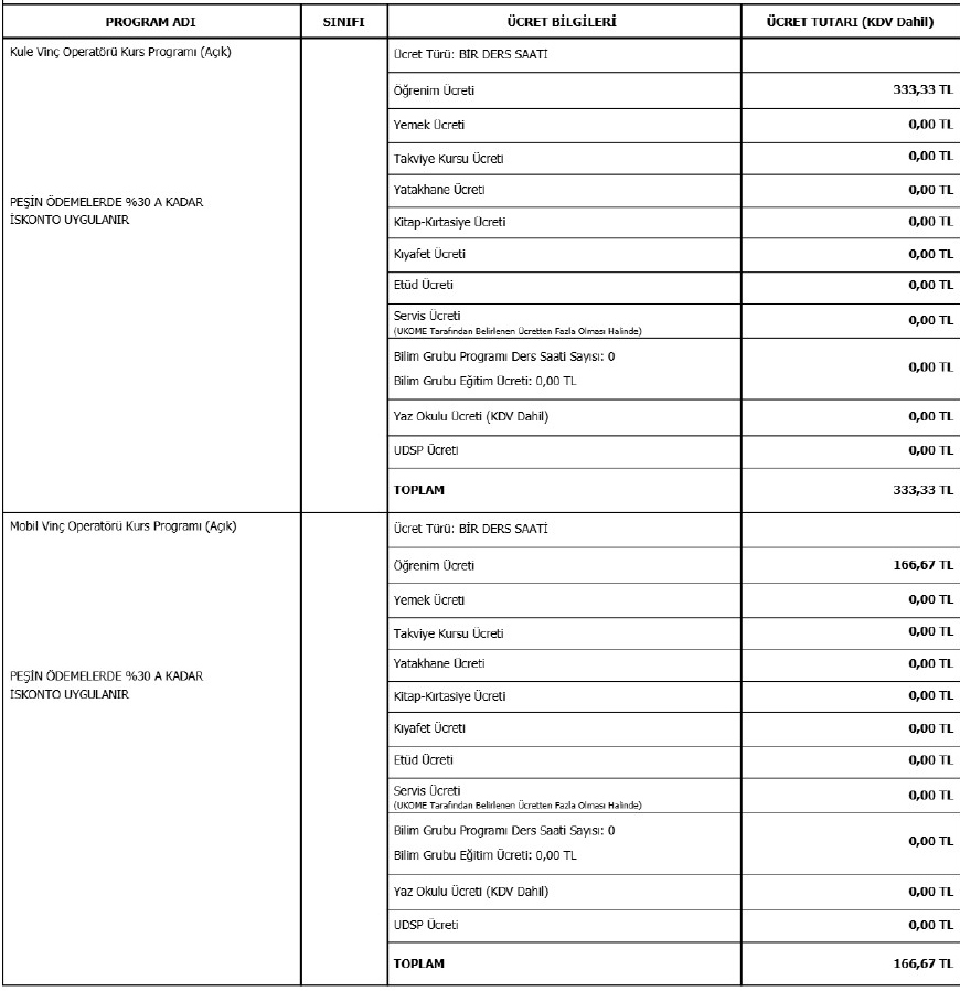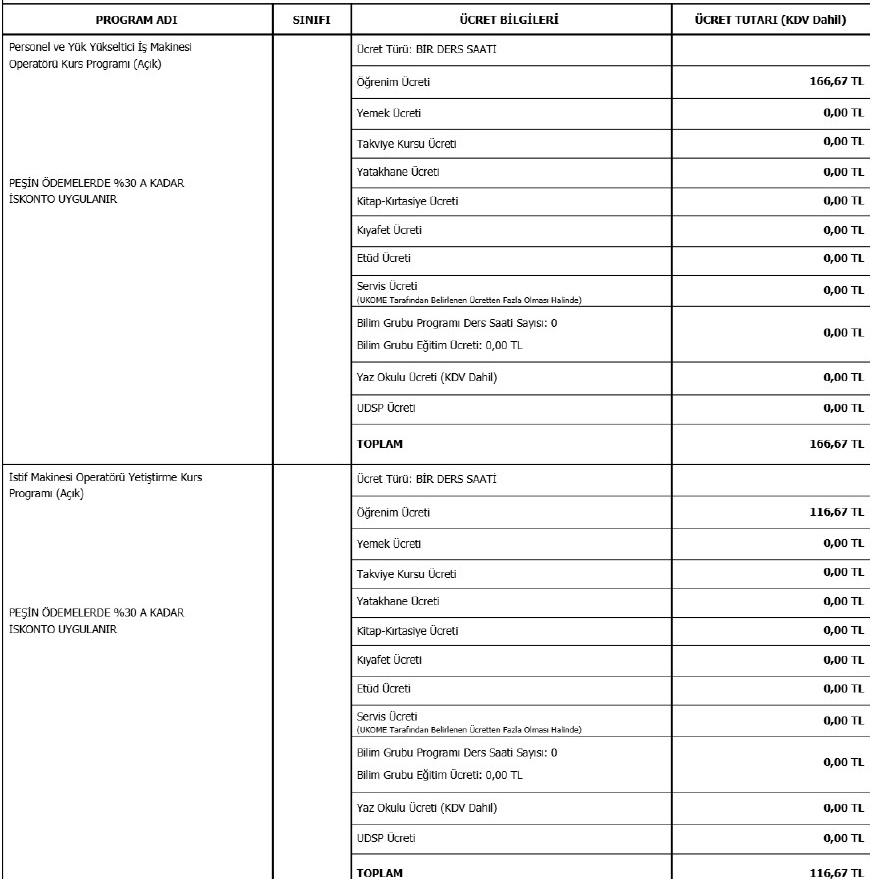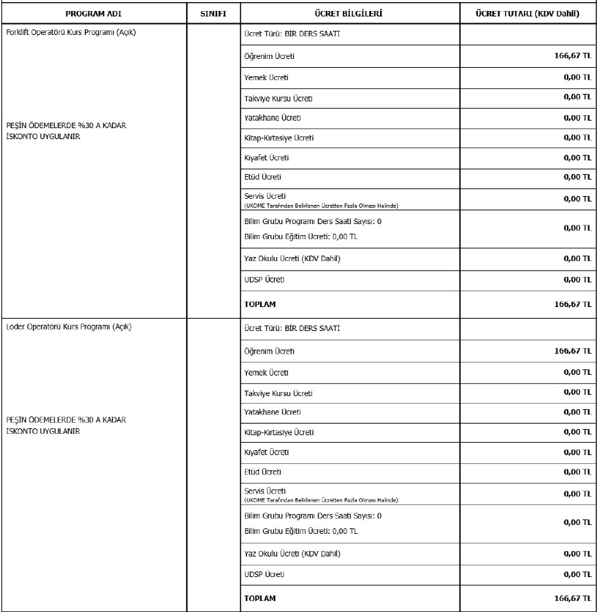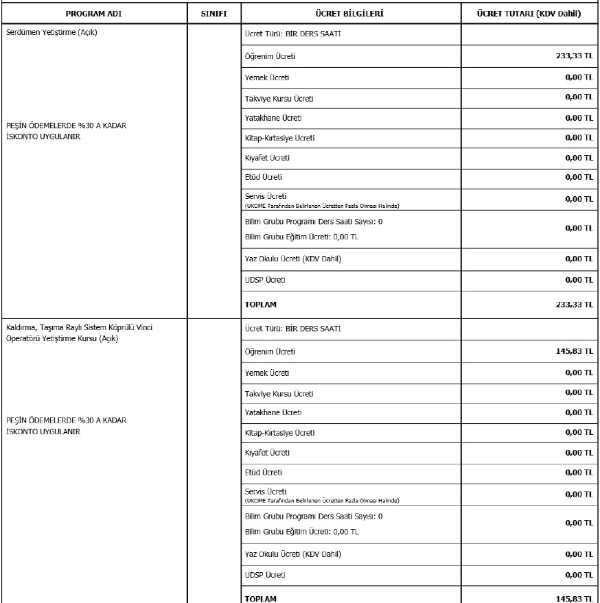 2026-2027 yılı içinde kurumumuzda uygulanacak olan programlar için ücret ilanı aşağıdaki gibidir.